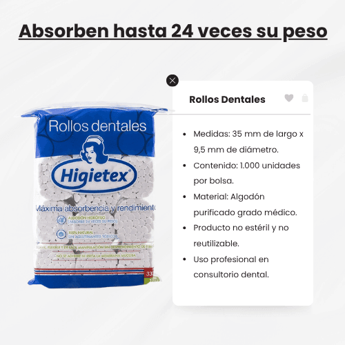 Los Rollos Dentales Higietex están diseñados para ofrecer una absorción superior de fluidos bucales durante limpiezas, restauraciones o cirugías dentales. Gracias a su composición 100% natural, libre de aglutinantes tóxicos, son seguros para el paciente y prácticos para el profesional.